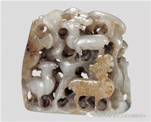 《金史》中记载,将有鹘攫天鹅图案的服饰称为“春水之饰”,将有虎鹿山林图案的服饰称为“秋山之饰”,故将此种玉器定名为“春水玉”和“秋山玉”。这类内容的作品,充满了淳朴的山林野趣和浓郁的北国情调,是极具草原游牧民族特色的玉器作品,虽内容大体一致,但每件的具体形式却绝无重复,达到了形散而神不散的艺术境界,充分体现了玉匠丰富的生活经验和卓越的观察力。