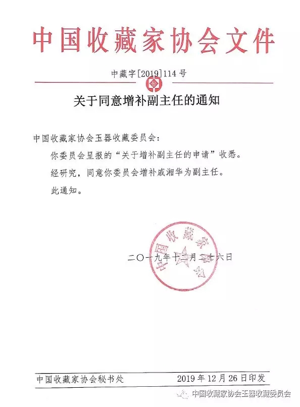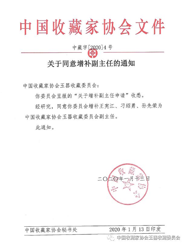 经中国收藏家协会批准,现增补戚湘华、孙先荣、王宪江、刁绍勇为中国收藏家协会玉器收藏委员会副主任;