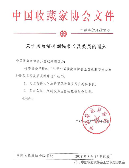 经中国收藏家协会批准,现增补关舒文为中国收藏家协会玉器收藏委员会副秘书长;马超、周制权为中国收藏家协会玉器收藏委员会委员。