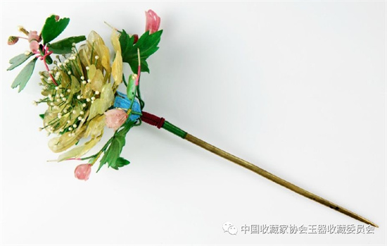 青白玉花鸟纹钗朵连铜钗股