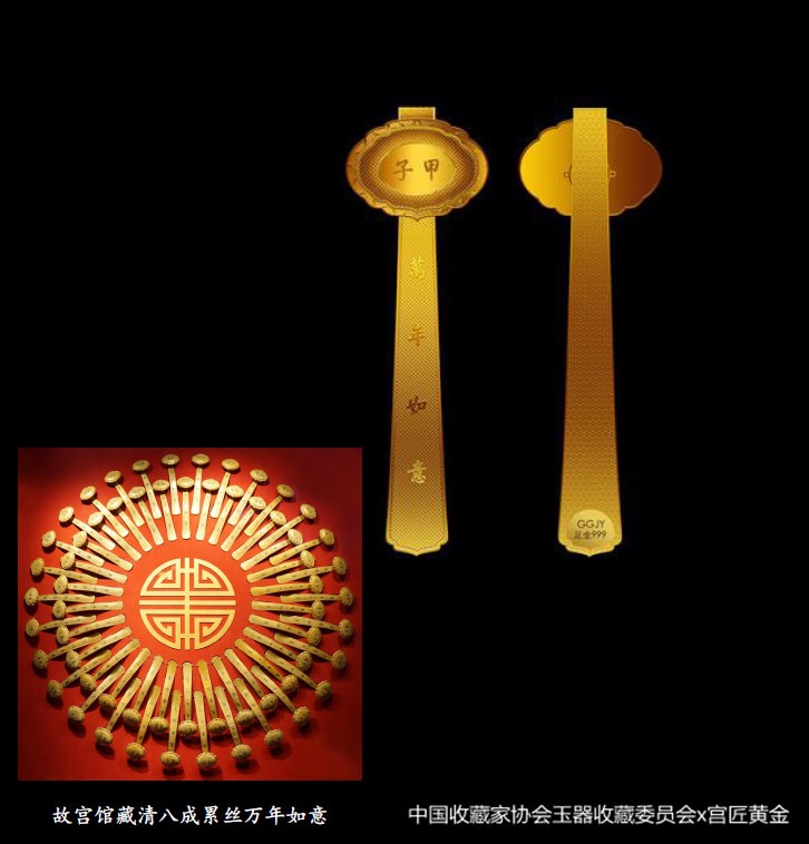 中国收藏家协会玉器收藏委员会携“宫匠黄金”出品《十朝十美·古玉金韵》暨《万年如意》系列。深度挖掘故宫文化内涵,推出系列故宫文化贵金属产品,用金工讲述文物的前世今生。
